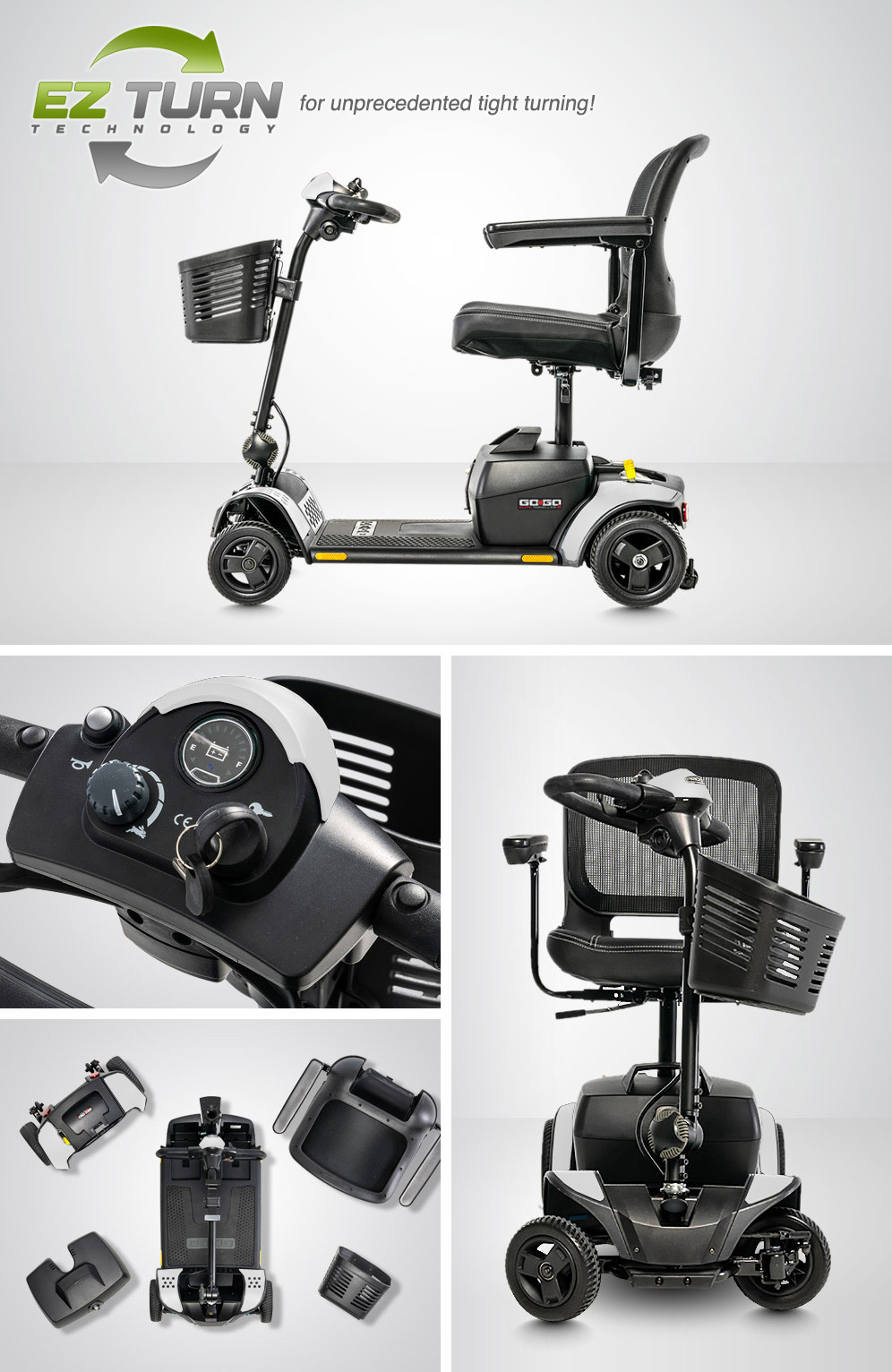 ON THE INTERNET. The Go Go Elite Traveller 2 It is the FIRST 4 wheel scooter of its kind. Pride's patentd EZ turn technology "Turns like a 3 wheeler" and you get the safety of a 4 wheeler.